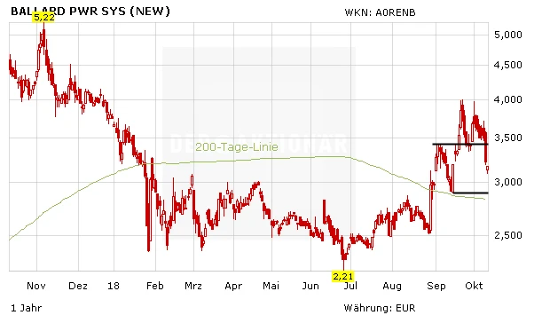 Im gestrigen Handel büßte die Ballard-Aktie 9,2 Prozent auf 3,65 Dollar ein, das Chartbild hat sich dadurch eingetrübt. Jedoch konnte das Papier des Brennstoffzellen-Pioniers im nachbörslichen Handel aufgrund der gesicherten Finanzierung des Projektes rund fünf Prozent wieder aufholen. Mutige Anleger nutzen den überzogenen Kursrutsch bei Ballard Power zum Einstieg, Stopp 2,45 Euro.