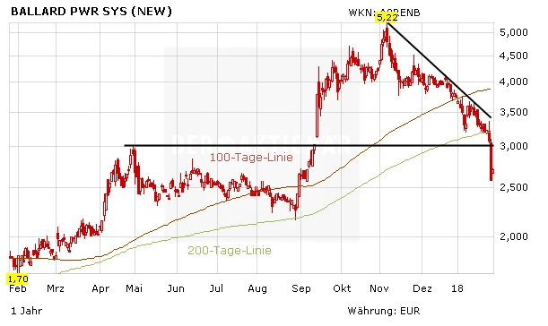 Ohne Frage, Ballard Power ist und bleibt eine heiße und langfristig aussichtsreiche Aktie. Aufgrund des stark angeschlagenen Chartbildes sollten interessierte Anleger aber vorerst an der Seitenlinie verharren und eine Bodenbildung abwarten. Kurzfristig könnte die Ballard-Aktie jedoch eine charttechnische Gegenbewegung nach dem gestrigen Abverkauf starten. Die AKTIONÄR-Empfehlung wurde in der vergangenen Woche mit dem Unterschreiten der Marke von 3,40 Euro ausgestoppt.