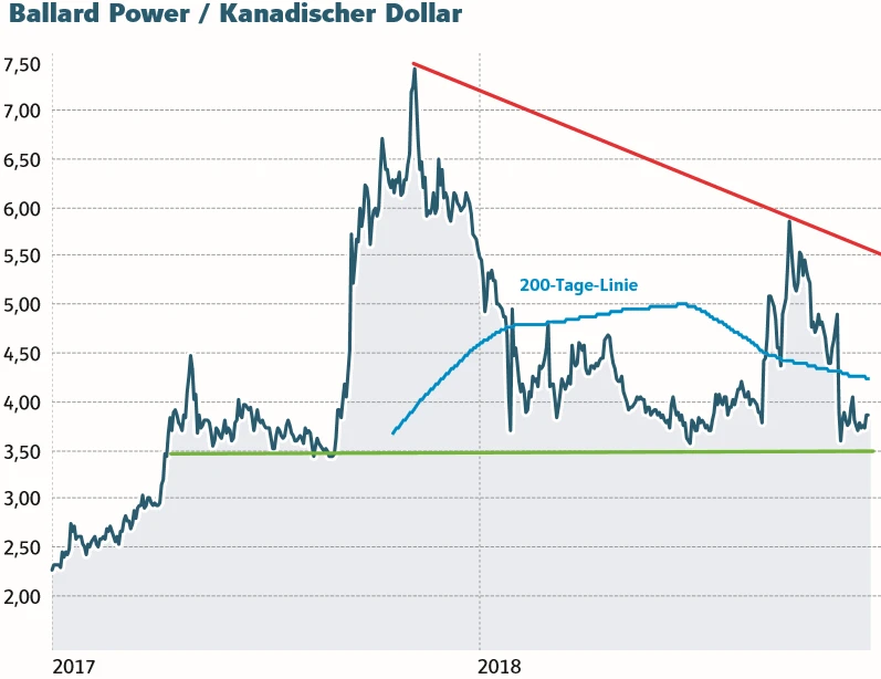 Die Aktie von Ballard Power liegt aktuell knapp über der wichtigen Unterstützung im Bereich 3,50 Kanadische Dollar. Die Zeichen, dass diese Marke hält, stehen gut. Denn auf diesem Level hat der Titel bereits im Jahr 2017 konsolidiert. Auch das Jahrestief verlief knapp über diesem Niveau.