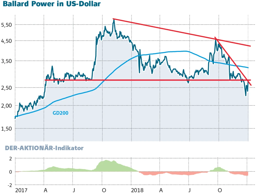 Im gestrigen Handel reagierte die Ballard-Power-Aktie mit einem Kurssprung von 13,4 Prozent auf 2,71 Dollar auf die sich scheinbar aufhellenden Rahmenbedingungen für Brennstoffzellen in China. Nun trifft das Papier auf eine hartnäckige Widerstandszone. Gelingt der nachhaltige Sprung über die Marke von 3,00 Dollar, können ausnahmslos spekulative Anleger den Hot-Stock wieder ins Auge fassen.