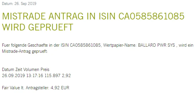 Ein Mistrade an der Börse in Frankfurt hat im gestrigen Handel offenbar für einen kurzen Schock unter den Aktionären von Ballard Power gesorgt. Plötzlich notierten die Papiere knapp 40 Prozent tiefer auf dem Handelsplatz. Die Deutsche Börse klärte den Fall schnell auf, doch der Mistrade kommt zu einem denkbar ungünstigen Zeitpunkt.