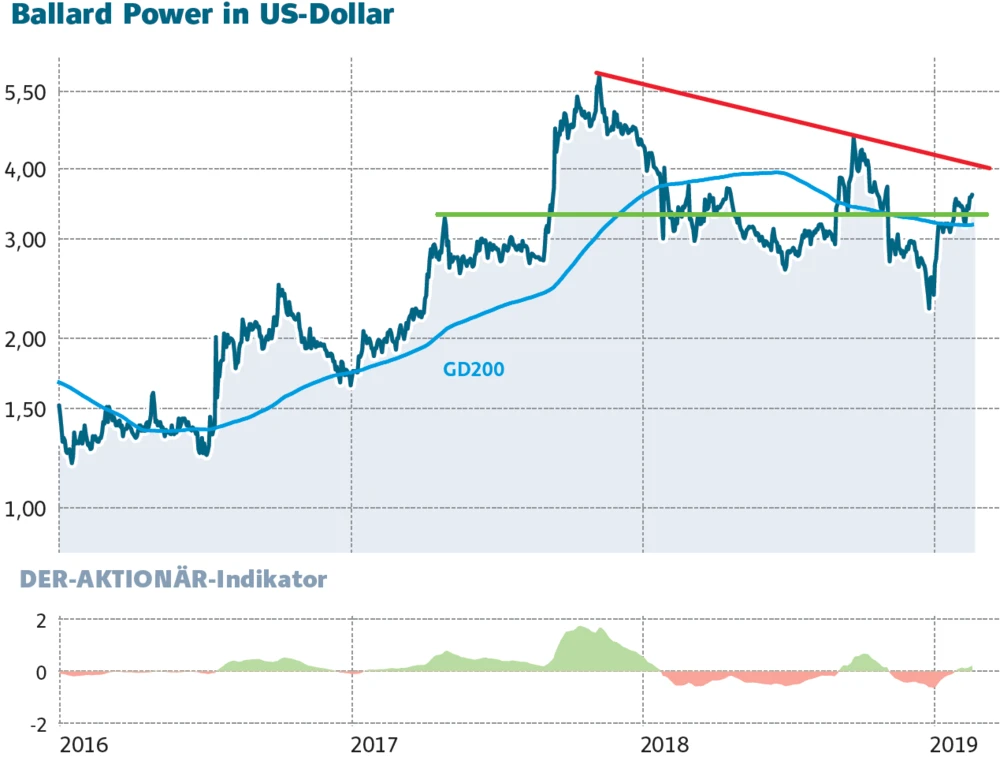 Nach dem erfolgreichen Test der 200-Tage-Linie hat die Ballard-Power-Aktie wieder nach oben gedreht und schickt sich nun an, das 2019er-Hoch bei 3,63 Dollar zu Überwinden. Wenn diese Marke fällt, stehen die Chancen gut, dass der Brennstoffzellen-Hot-Stock in Richtung 4,00 Dollar vorstoßen kann. Nicht vergessen: Im März wird Ballard Power frische Quartalszahlen präsentieren. Wer der jüngsten spekulativen Trading-Empfehlung gefolgt ist, bleibt an Bord. Der Stopp sichert knapp unterhalb der 200-Tage-Linie bei 3,15 Dollar ab.
