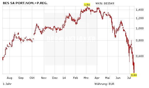 Ende Juni hatte bereits Ricardo Espirito Santo Salgado nach 22 Jahren (!) seinen Chefsessel räumen müssen. Allerdings sitzen immer noch einige Familienmitglieder des mächtigen Familienclans im hohen Management der Bank. Zur Wiederherstellung des Vertrauens soll nun mit sofortiger Wirkung der Vorstand ausgetauscht werden. Zwar haben BES und die Zentralbank bereits mehrfach erklärt, dass die Kundeneinlagen bei der Bank nicht in Gefahr seien, dennoch bleiben die Marktteilnehmer sehr nervös und schicken die Aktie in den Keller. Nun wurde auch noch beklannt gegeben, dass die in Zahlungsschwierigkeiten geratene Espirito Santo Finmancial Holding 4,99 Prozent ihrer 25-prozentigen Beteiligung an BES auf den Markt geworfen hat.