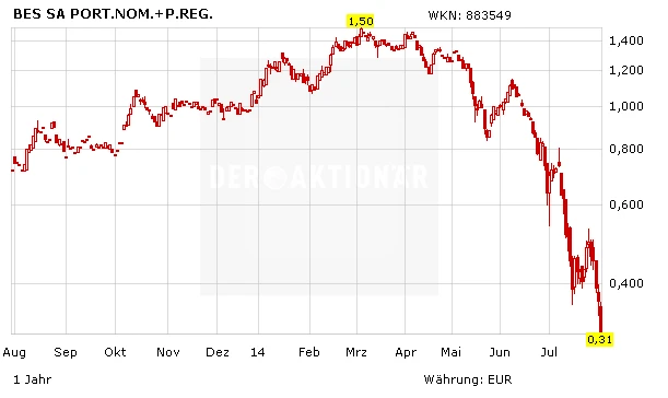Die Aktie der Banco Espirito Santo (BES) ist nach den gestrigen Zahlen erheblich unter Beschuss geraten. Nachdem die Papiere in Portugal angesichts des hohen Fehlbetrags des Kreditinstituts in Höhe von 3,6 Milliarden Euro noch bis 10:00 Uhr vom Handel ausgesetzt waren, ging es nach Wiederaufnahme sofort in den Keller. Aktuell verliert der Kurs satte 50 Prozent und ist unter den empfohlenen Stoppkurs des AKTIONÄR bei 0,33 Euro gerauscht.