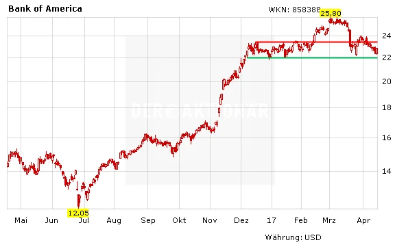 Die jüngsten Zahlen zeigen klar die positive Gewinnentwicklung bei der Bank of America. Die Fed hat für das Jahr 2017 noch zwei weitere Zinserhöhungen in Aussicht gestellt. Hiervon sollte die Notierung weiter Rückenwind erhalten. Die widersprüchlichen Aussagen von US-Präsident Donald Trump zu etlichen Themen und die Wahlen in Europa sollten weiterhin für ein hohes Handelsvolumen und somit steigende Umsätze sorgen.