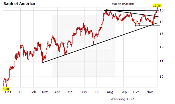 Die Aktie der Bank of America hat nach der beeindruckenden Erholungsrallye der vorangegangenen Monate seit Sommer konsolidiert. Nun hat der Kurs jedoch wieder Fahrt aufgenommen. Anfang November glückte der Ausbruch aus dem kurzfristigen Abwärtstrend, gestern hievte sich die Aktie des Bankenriesen aus Charlotte sogar über das bisherige Jahreshoch bei 15 Dollar. Nun ist der Weg nach oben vorerst frei.