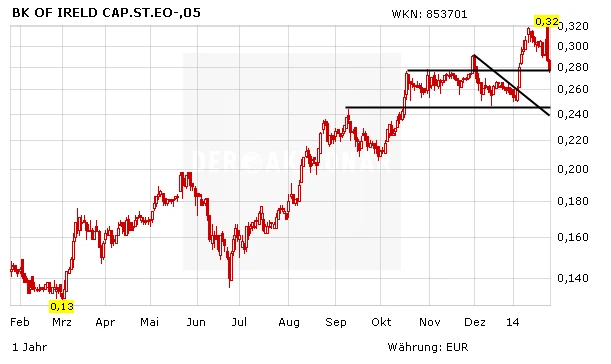 DER AKTIONÄR hält an seiner Kaufempfehlung für die Aktie der Bank of Ireland fest. Die irische Wirtschaft dürfte sich 2014 weiter erholen, wovon die Bank of Ireland überproportional profitieren dürfte. Die Titel bleiben für mutige Anleger weiterhin attraktiv, der Stoppkurs sollte bei 0,22 Euro belassen werden.