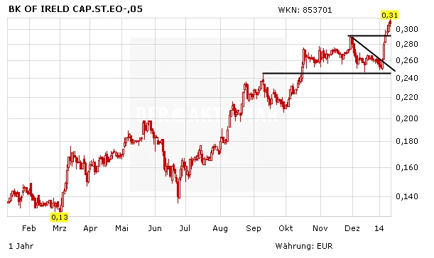 Die jüngste Anleihenemission der Bank of Ireland war Konzernangaben zufolge vor allem außerhalb Europas sehr begehrt. Der Aktienkurs ist indes über die Marke von 30 Cent geklettert und hat sich ausgehend vom Tief Anfang 2013 fast verdreifacht.