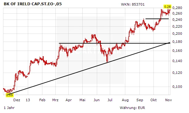 Die Aktie der Bank of Ireland bleibt für mutige Anleger weiterhin attraktiv. Die fundamentale Lage hellt sich weiter auf und die charttechnische Situation ist ebenfalls vielversprechend. Der Stoppkurs sollte zur Gewinnsicherung auf 0,18 Euro nachgezogen werden.