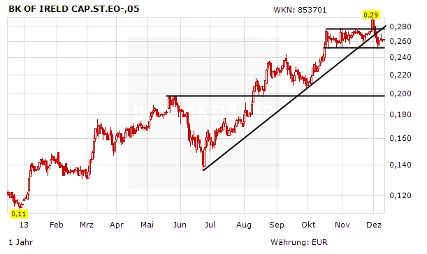 11 Cent kostete eine Aktie der Bank of Ireland Anfang des Börsenjahres 2013. Dies war auch gleichzeitig das Jahrestief, denn die Anteile der größten irischen Bank verteuerten sich dank der positiven Entwicklung der irischen Wirtschaft kräftig. In den vergangenen Wochen stagnierte der Aktienkurs allerdings um den Bereich von 0,25 beziehungsweise 0,28 Euro. Verständlich, dass sich nun viele Anleger fragen, ob das Ende der Rallye naht.