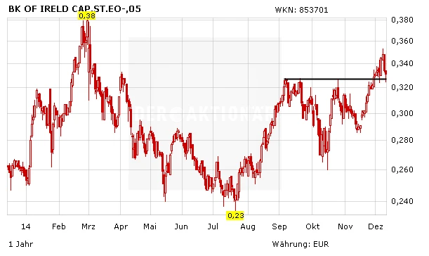 Die Aussichten für die Bank of Ireland sind dank der sehr starken Konjunktur in Irland natürlich sehr gut. Allerdings ist die Aktie mit einem 2015er-KGV von 17 und einem KBV von 1,4 auch kein Schnäppchen mehr, weshalb nur mutige Anleger zugreifen sollten. Wer bereits investiert ist, sollte dabeibleiben und den Stopp auf 0,25 Euro nachziehen.