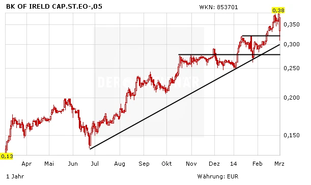 Die heute vorgelegten Zahlen sind zwar gut, der Chartverlauf der vergangenen Monate hat aber bereits eine Großteil der positiven Entwicklung gewissermaßen eingepreist und die Aktie ist kein Schnäppchen mehr. Nachdem sich mittlerweile eine Fahnenstange ausgebildet hat, sollten noch nicht investierte Anleger zunächst Rücksetzer abwarten. Wer bereits Aktien der Bank of Ireland besitzt, sollte nun zur Gewinnsicherung den Stoppkurs auf 0,26 Euro nachziehen.