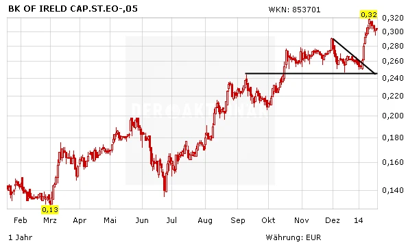 DER AKTIONÄR bleibt für die Aktie der Bank of Ireland hingegen weiter zuversichtlich gestimmt. Wegen der hohen Volatilität der Aktie sowie der weiterhin bestehenden Risiken sollten allerdings nach wie vor lediglich mutige Anleger zugreifen. Der Stopp sollte bei 0,22 Euro belassen werden.