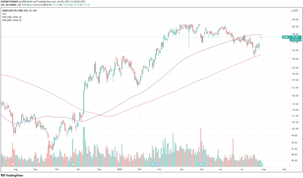 Die Empfehlung des AKTIONÄR zu Barclays stammt aus dem Februar dieses Jahres, bisher stehen mehr als 30 Prozent Plus zu Buche. Der heutige Kurssprung treibt die Notierung fast über die 100-Tage-Linie bei 178,70 britischen Pence. Die für 2021 erwartete Dividendenrendite von mehr als drei Prozent ist für Anleger zudem attraktiv.