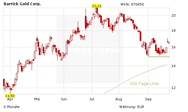 Die FED-Entscheidung am Mittwoch befeuerte auch wieder den Aktienkurs. Die Papiere sprangen auf 18,69 Dollar. Der Rücksetzer seit Anfang August ist jedoch nicht nur den jüngsten Problemen geschuldet, sondern war eine normale Konsolidierung im Zuge der vorangegangenen 200-Prozent-Rallye. Die Chancen auf eine kurzfristige Trendwende stehen gut. Die Aktien von Barrick Gold sollten ihren Boden gefunden haben.