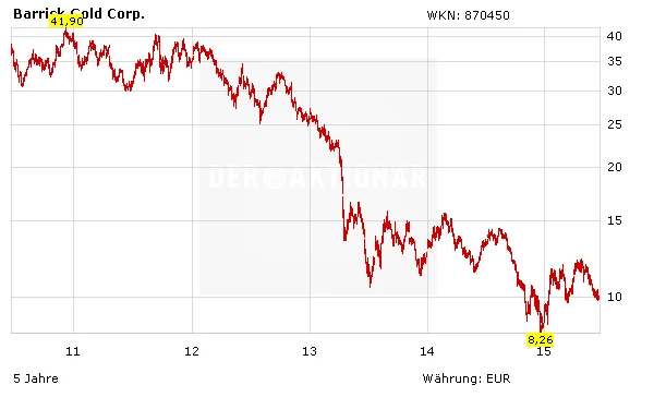 Diesbezüglich sind sich allerdings auch die Analysten eher uneinig. Von den 30 Experten, die sich regelmäßig mit der Aktie von Barrick Gold befassen, raten neun zum Kauf. 16 Analysten stufen die Papiere der Kanadier mit Halten ein, fünf empfehlen den Verkauf. Das durchschnittliche Kursziel liegt mit 13,71 Dollar jedoch stattliche 23 Prozent über dem Schlusskurs von gestern Abend (11,11 Dollar).