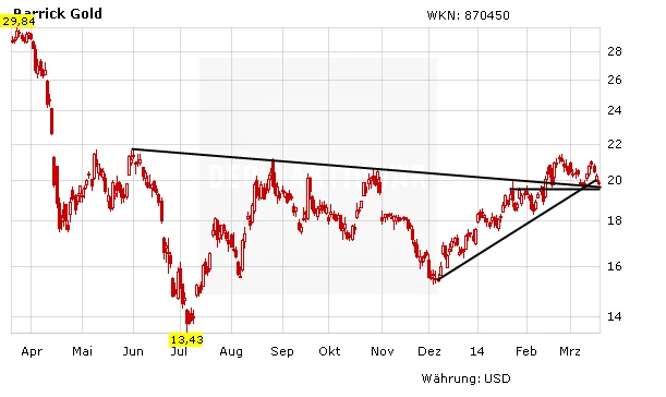 Der Goldpreis findet keinen Boden. Die Krim-Krise entspannt sich gerade und Anleger nehmen die Gewinne der ersten zwei Monate des Jahres mit. Das sorgt auch für Druck bei der Aktie von Barrick Gold. Das Papier steht charttechnisch gesehen am Scheideweg. Anleger sollten auf der Hut sein.