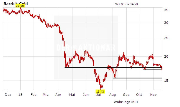 Am Mittwoch hatte der Kurs deutlich nachgegeben und dabei die Unterstützung bei 17,51 Dollar, dem Tief von April dieses Jahres, unterschritten. Barrick Gold schloss bei 17,18 Dollar und damit hauchdünn über dem Oktobertief von 17,13 Dollar. Im Tagesverlauf hatte die Aktie diese Marke schon unterschritten, sich aber wieder leicht erholt.
