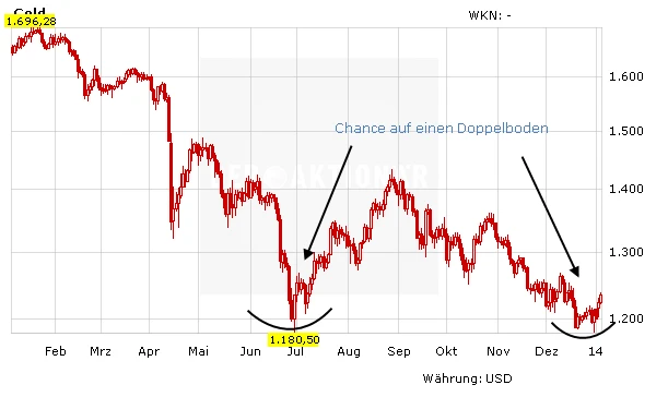 Doch natürlich hängt die weitere Entwicklung des Aktienkurses von Barrick Gold vor allem an der Entwicklung des Goldpreises. Und dort schöpft der eine oder andere Anleger zumindest wieder ein Fünkchen Hoffnung. Aus charttechnischer Sicht deutet sich bei Gold ein Doppelboden an. Die 1.180-Dollar-Marke konnte verteidigt werden – und das ist erst einmal ein gutes Zeichen. Noch ist es für Euphorie zu früh: Doch aus charttechnischer Sicht könnte dies tatsächlich die Grundlage für eine nachhaltige Trendwende sein.