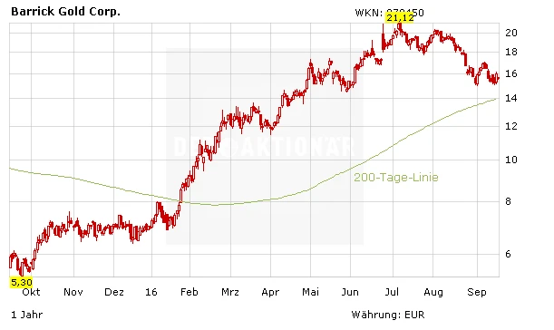 Die Aktien von Barrick Gold underperformen momentan andere große Goldkonzerne wie Agnico Eagle oder Newmont Mining. Investierte Anleger sollten aber dabeibleiben. Denn wenn der Goldpreis steigt, werden auch die Papiere von Barrick wieder steigen. Anleger setzen den Stopp bei 14,00 Euro und das Kursziel bei 25,00 Euro.
