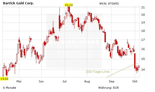 Nicht zuletzt deswegen stiegen die Aktien von Barrick Gold im Montagshandel knapp zwei Prozent an. Das Kursplus ist auf einen erholten Goldpreis zurückzuführen. Nach dem deutlich überverkauften Markt war eine Erholung abzusehen. Dennoch ist die Gefahr vor weiteren Rücksetzern noch nicht gebannt. Mehr Impulse von Barrick Gold sind am 26. Oktober mit den Q3-Zahlen zu erwarten. Bis dahin sollten Anleger die Füße still halten.