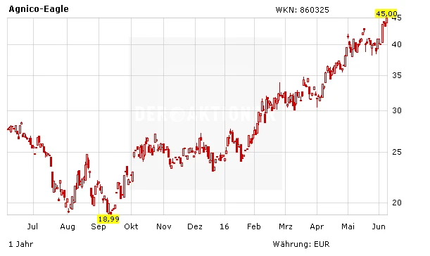 Gold notiert vor der Börseneröffnung in den USA und Kanada deutlich im Plus. Und Silber nähert sich bereits wieder der 17-Dollar-Marke. Die Minenaktien, die die Konsolidierung von Gold und Silber nur am Rande mitgemacht haben, scheinen nach oben ausbrechen zu wollen. Einzelne Aktien wie zum Beispiel Agnice Eagle, haben bereits ein neues Jahreshoch gemacht. Andere, wie Barrick Gold oder auch Newmont Mining stehen kurz davor. Ein Paradies für die Anleger.
