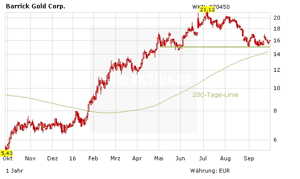 Anleger können ebenfalls wieder etwas aufatmen, denn mittlerweile scheint sich die Abwärtsdynamik der Barrick-Gold-Aktie zu verlangsamen. Aus charttechnischer Sicht besteht sogar die Chance auf eine Trendwende. Wenn die Vergangenheit eines bewiesen hat, dann dass mit einem steigenden Goldpreis auch dieser Titel wieder ansteigen wird.