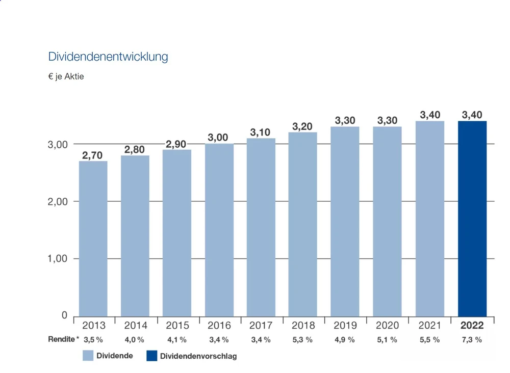 Für 2022 sollen die Anteilseigner des Chemiekonzerns wie im Vorjahr eine Dividende von 3,40 Euro je Aktie erhalten. Daraus errechnet sich ausgehend vom aktuellen Kursniveau eine Dividendenrendite von 6,7 Prozent.