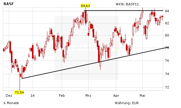 BASF bleibt in der Chemiebranche ein Basisinvestment. Der Konzern ist hervorragend aufgestellt und sollte von Wachstum der Schiefergasbranche deutlich profitieren. Mit einem KGV von 15 für 2014 bleibt der Chemieriese günstig bewertet. Gelingt dem Wert der Ausbruch über das Allzeithoch bei 84,63 Euro, würde dies ein massives Kaufsignal generieren. Langfristig sind Kurse von 96,00 durchaus gerechtfertigt.