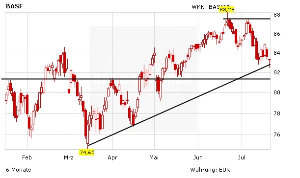 Analyst Christoph Schöndube hat BASF vor Zahlen für das zweite Quartal die am 24. Juli bekannt gegeben werden auf "Halten" mit einem Kursziel von 88 Euro belassen. Er rechne mit einem Umsatzanstieg um 1,2 Prozent, schrieb der Experte in einer Studie vom Freitag. Dabei sollte der Chemiekonzern erneut von seinem Agrarbereich profitiert haben. Das operative Ergebnis (EBIT) sieht er bei 1,99 Milliarden Euro und den Überschuss bei 1,4 Milliarden Euro. Den Ausblick dürfte BASF wohl bestätigen.
