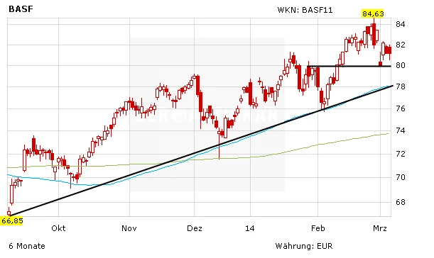 DER AKTIONÄR hält an seiner positiven Meinung für BASF fest. Die Aktie bleibt mit einer starken Dividendenrendite von 3,3 Prozent und einem KGV von 14 nach wie vor ein attraktiv bewertet. Investierte Anleger bleiben dabei. Ein Kursziel von 95 Euro wäre weiter gerechtfertigt.