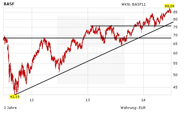 Die BASF-Aktie beleibt einer der Top-Werte im deutschen Leitindex und gehört als Basisinvestment in jedes Depot. Nicht nur die solide Dividendenpolitik, auch die Performance der Aktie lässt Anlegerherzen höher schlagen. Der Konzern ist hervorragend aufgestellt und mit einem KGV von 15 für 2014 ist der Chemieriese günstig bewertet. DER AKTIONÄR sieht das Kursziel bei 95 Euro. Für einen Neueinstieg ist es noch nicht zu spät.