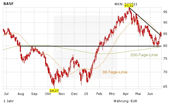 DER AKTIONÄR ist für BASF weiterhin optimistisch. Mittelfristig sind die Aussichten des Weltmarktführers weiterhin glänzend. Zudem ist die Bewertung mit einem KGV von 15 noch immer günstig. Analysten rechnen bei der nächsten Dividendenzahlung im Mai 2016 mit einer Ausschüttung von 2,90 Euro je Aktie, was einer Dividendenrendite von mehr als drei Prozent auf dem aktuellen Kursniveau entspricht. Ein Stopp bei 73 Euro sichert die Position nach unten ab.