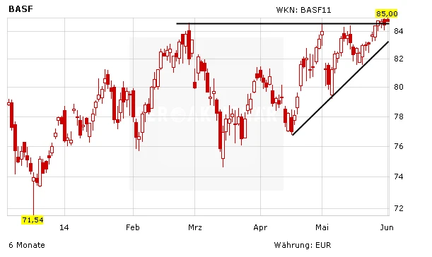 Die Aktie von BASF ist nicht zu stoppen. Ein neues Hoch nach dem anderen markiert der Chemiekonzern – zuletzt kletterte das Papier auf 85 Euro. Wird der Ausbruch über das bisherige Allzeithoch bestätigt, ist der Weg aus charttechnischer Sicht nach oben frei.