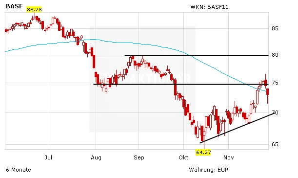 Aus charttechnischer Sicht konnte sich die BASF-Aktie zuletzt deutlich erholen. Seit dem Oktobertief bei 64,10 Euro konnte der Wert rund zwölf Prozent zulegen. Zuletzt stellte allerdings die 75-Euro-Marke einen massiven Widerstand dar. Durch den Rücksetzer am Freitag notiert der Titel nun auch unter der 90-Tage-Linie bei 73,53 Euro. Eine Unterstützung findet sich allerdings im Bereich von 70,00 Euro.