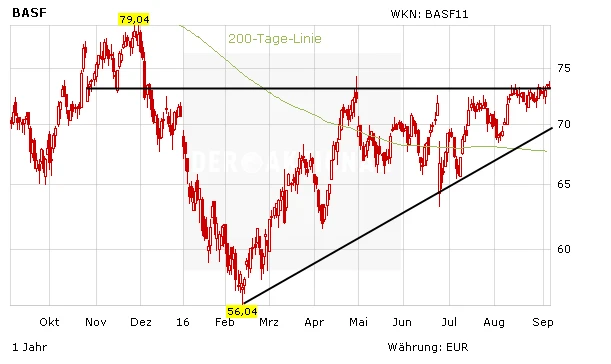 Die BASF-Aktie hat am Dienstag ein neues Jahreshoch erreicht. Aus charttechnischer Sicht liegt die nächste Hürde nun beim 52-Wochen-Hoch bei 79,04 Euro. Operativ dürfte sich das Geschäft wieder erholen und die moderate Bewertung spricht ebenfalls für den Chemieriesen. Anleger setzen auf den Ausbruch und bleiben an Bord. Der Stopp liegt bei 58 Euro.