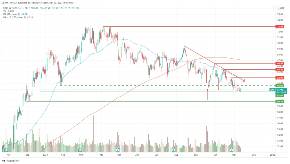 Die bisherige Jahresperformance der BASF-Aktie ist ernüchternd. Im Frühling erreicht die Aktie ein Jahreshoch bei 72,88 Euro, was ausgehend vom Jahresstart ein Zugewinn von 12,5 Prozent entspricht. Nach mehreren gescheiterten Ausbruchsversuchen kippte die Stimmung bei den Investoren und so verlor der Titel langsam aber kontinuierlich an Wert.