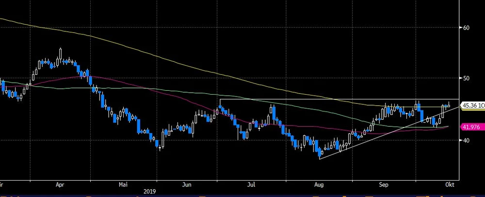 Immerhin hat sich der DAX-Titel wieder an den Widerstandsbereich bei 46 Euro herangekämpft und sich über den kürzlich gebrochenen Aufwärtstrend gehievt. Nun wird es spannend, ob im fünften Versuch endlich der Ausbruch gelingt. Anleger warten noch ab.