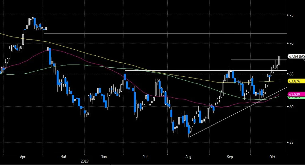So gelang es dem DAX-Titel, das September-Zwischenhoch bei 67,24 Euro zu überwinden. Nun wäre rein charttechnisch betrachtet der Weg nach oben nun vorerst frei. Gut möglich, dass die BASF-Aktie nun Kurs bis in den Bereich von über 70 Euro nimmt. Dann dürfte auch das durch die Dividendenzahlung im Mai aufgerissene Gap bei 71,86 Euro geschlossen werden.