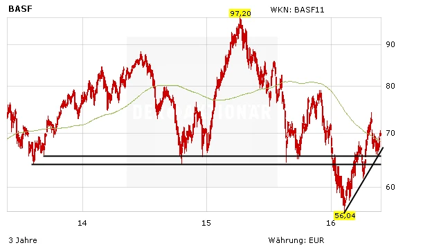 Auch DER AKTIONÄR bleibt für die Aktie von BASF positiv gestimmt. Trotz der aktuell schwierigen Marktlage sind die mittel- bis langfristigen Aussichten für den Chemie-Weltmarktführer nach wie vor gut. Der Stopp sollte bei 55,50 Euro platziert werden.