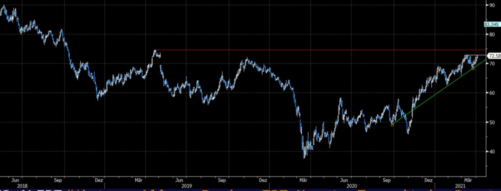 Aktuell notiert der DAX-Titel nur ganz knapp unter dem Jahreshoch bei 72,84 Euro. Sollte diese Marke übersprungen werden, lauert allerdings gleich danach der nächste wichtige Widerstand in Form des kurz vor dem Corona-Crash markierten 2020er-Hochs bei 74,61 Euro. Sollte auch diese Hürde genommen werden, wäre rein charttechnisch betrachtet sogar der Weg nach oben frei bis zum Zwischenhoch aus dem September 2019 bei 81,63 Euro.