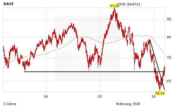Das schwierige Marktumfeld spricht derzeit eher gegen einen Einstieg bei BASF. Allerdings sollte auf dem aktuellen Kursniveau bereits sehr viel schon eingepreist sein. Die Qualitätstitel werden derzeit mit einem 2017er-KGV von 13 und einem KBV von 1,8 bewertet, was im historischne Vergleich noch günstig ist. Zudem beläuft sich die Dividendenrendite auf satte 4,7 Prozent. Wegen des gerade geglückten Sprungs über den Widerstand bei 64 Euro können mutige Anleger nun dennoch zugreifen (Stopp: 55,50 Euro).