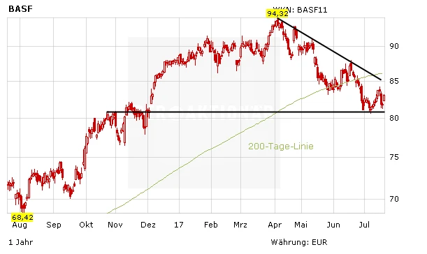 Für die BASF-Aktie ist der heutige Kursanstieg wichtig. Denn im Falle des Bruchs des Unterstützungsbereichs bei 80,90 Euro würde sich das Chartbild weiter eintrüben. Noch nicht investierte Anleger können vorerst weiterhin an der Seitenlinie verharren, bereits investierte Anleger an Bord bleiben (Stopp: 68,00 Euro).