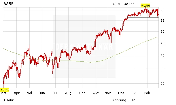 So hat Analyst Tim Jones das Kursziel für die DAX-Titel von 95 auf 101 Euro angehoben und seine Einstufung erneut mit „Buy“ bestätigt. Er betonte, dass der Chemieriese im vierten Quartal 2016 „erfreulich“ abgeschnitten habe und lobte auch den Start in das neue Jahr. Trotz des eher konservativen Ausblicks des Vorstandes bleibt Jones für BASF zuversichtlich gestimmt und rechnet mit einem operativen Ergebnis, das deutlich über dem Marktkonsens liegen dürfte.