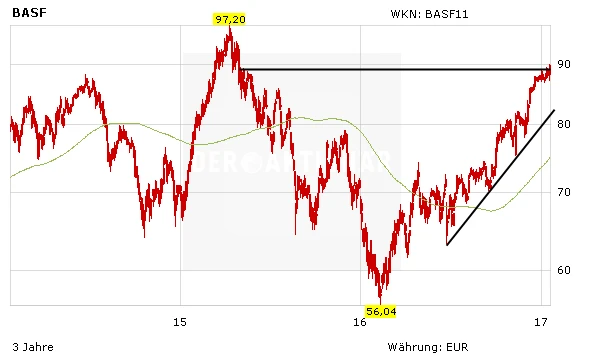 Gelingt es dem Aktienkurs in den nächsten Handelstagen, sich nachhaltig über dem alten 52-Wochen-Hoch bei 89,47 Euro zu halten, stehen die Chancen gut, dass der DAX-Titel in den kommenden Wochen und Monaten wieder Kurs auf das Allzeithoch bei 97,22 Euro nimmt. Die sich aufhellenden konjunkturellen Perspektiven, die zuletzt robuste Ölpreisentwicklung und das derzeit ohnehin positive Sentiment für Chemieaktien dürften den BASF-Titeln weiterhin Rückenwind verleihen.