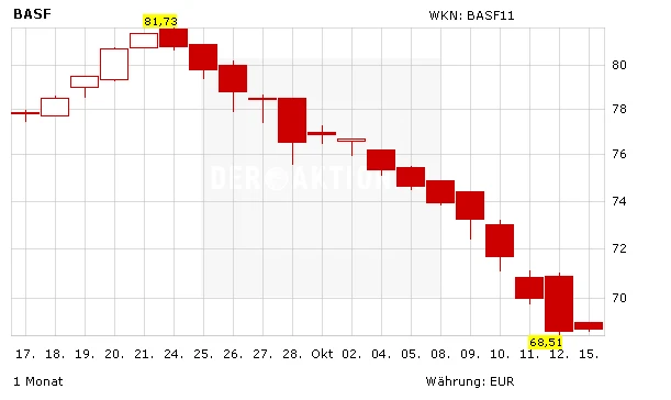 Das Drama geht weiter: Auch heute dürfte die BASF-Aktie mit Verlusten eröffnen. Der Blick auf den Candle-Stick-Chart der letzten 15 Tage ist ein wahres Bild des Grauens: Einer einzigen grünen Kerze, bei der die Papiere des Chemieriesen im Tagesverlauf Boden gut machen konnten, stehen 14 roten Kerzen gegenüber …