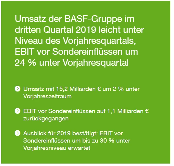 Den Ausblick für das laufende Jahr bestätigte BASF. Im Sommer hatte das Unternehmen die Jahresprognose wegen der Autoflaute und des Zollstreits zwischen den USA und China kräftig zusammengestrichen.