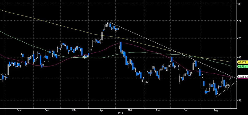 Denn die BASF-Aktie hat sich nun wieder über die 60-Euro-Marke gekämpft. Nun notiert der Kurs nahezu exakt an dem seit April gültigen Abwärtstrend, an dessen Ausbruch die Papiere in den vergangenen Wochen immer wieder gescheitert sind. Sollte der Ausbruch aus dem Abwärtstrend gelingen, wäre der Weg nach oben zunächst frei bis zum Widerstand bei 64,19 Euro und anschließend bis 65,36 Euro.