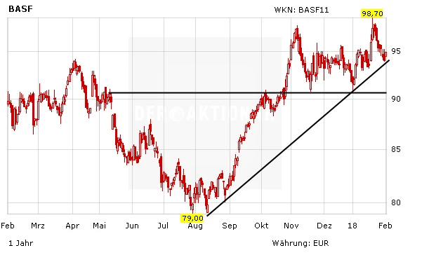Die Vorzeichen für einen nachhaltig anziehenden Aktienkurs sind bei BASF derzeit wirklich gut. DER AKTIONÄR erwartet, dass die Qualitätstitel in den kommenden Wochen erstmals in der Firmengeschichte die Marke von 100 Euro überwinden wird. Anleger können sich die DAX-Titel weiter ins Depot legen, der Stopp sollte bei 75,00 Euro belassen werden.