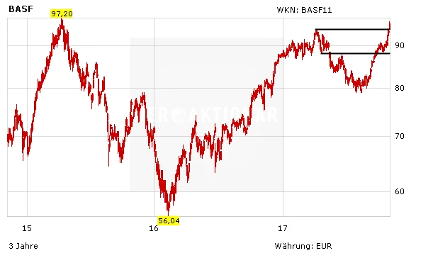 Rein charttechnisch betrachtet hätte die BASF-Aktie zunächst noch Luft bis zur Marke von 97,22 Euro, dem Allzeithoch aus dem Oktober 2015. Würde auch diese Hürde genommen, wäre der Weg nach oben frei. Dreistellige Kurse sind dann durchaus möglich. Allerdings sollte angesichts des sehr starken Kursanstieges der vergangenen Wochen mit deutlichen Korrekturen im Zuge von Gewinnmitnahmen gerechnet werden. Eine nahtlose Fortsetzung der ausgebildeten Fahnenstange ist eher unwahrscheinlich. Dennoch dürfte sich der Aufwärtstrend mittel- bis langfristig weiter fortsetzen. Die robuste Konjunktur, die höheren Ölpreise und die anhaltend gute Börsenstimmung sollten BASF weiterhin Rückenwind verleihen.